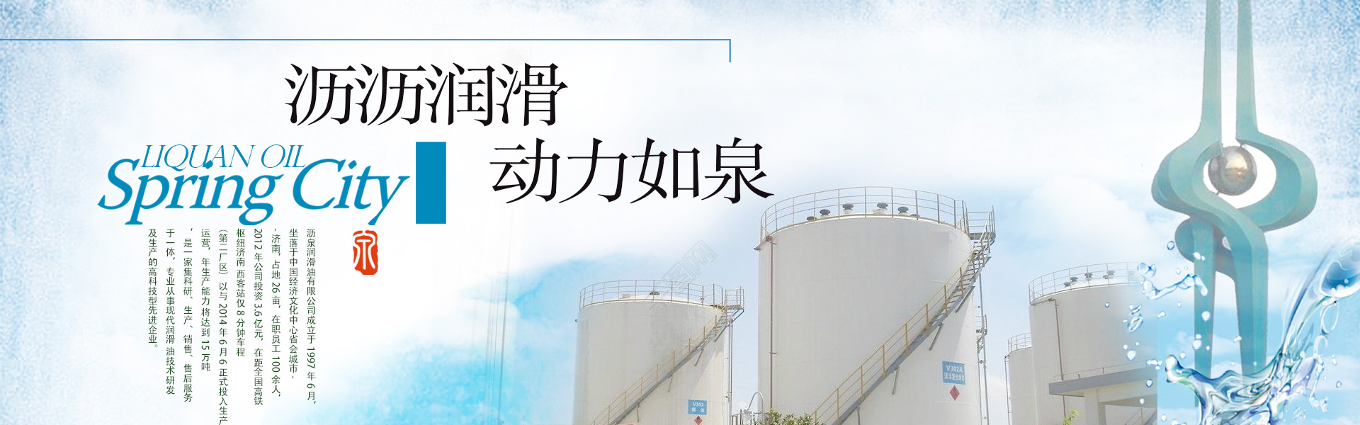 瀝泉潤滑油有限公司成立于1997年6月,坐落于中國經濟文化中心省會城市--濟南, 占地26畝,在職員工100余人,2012年公司投資3.6億元,在距全國高鐵樞紐濟南 西客站僅8分鐘車程(第二廠區)以與2014年6月6正式投入生產運營,年生產能力 將達到15萬噸,是一家集生產、銷售、售后服務于一體,專業從事潤滑油生產的企業。 產品共有15大類,150多個品種,廣泛應用于汽車、工程機械、船舶、冶金、發電 機組、工業設備、軍工等領域。 公司產品已形成多系列、多品種、多規格的格局。并在30多個省市自治區建立400 多家代理商。經銷商8000多家,深受用戶好評! 在潤滑油行業領域展現著她傲人的身姿。公司秉承“以人品打造精品,以精品奉獻 客戶”的企業理念,引進國內外先進企業管理經驗和管理方法